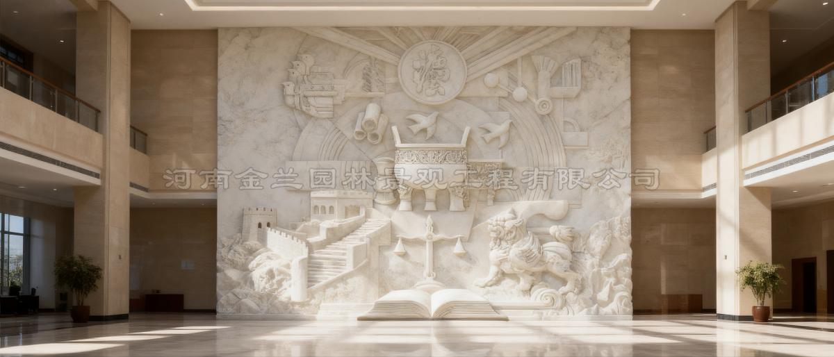 科学设计是品质保障的首要环节。专业设计需满足三重要求:一是符号合规性,提炼法槌、宪法卷轴等核心元素,参照《最高人民法院文化建设指导意见》进行模数化设计;二是空间适配性,通过BIM技术扫描现场,确保浮雕尺寸与承重墙负荷精准匹配,误差控制在±1mm内;三是文化兼容性,如金兰园林将甲骨文法治纹样融入设计,形成“传统符号+现代审美”的创作范式。其设计方案需经法学专家、建筑师双重评审,规避符号误用风险。