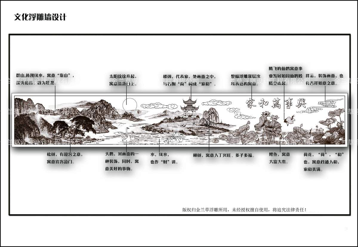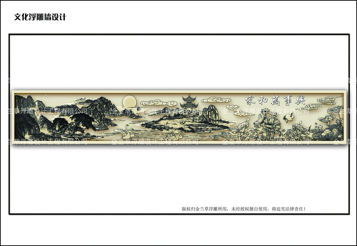 在对浮雕所处位置有所了解的情况下,在设计中选择了山水风景的表现方式。整幅浮雕设计的大主题为“家和”,通过对自然风光的描绘,体现了“大好河山(风水)”、“家(人)和兴旺”的表现主旨。