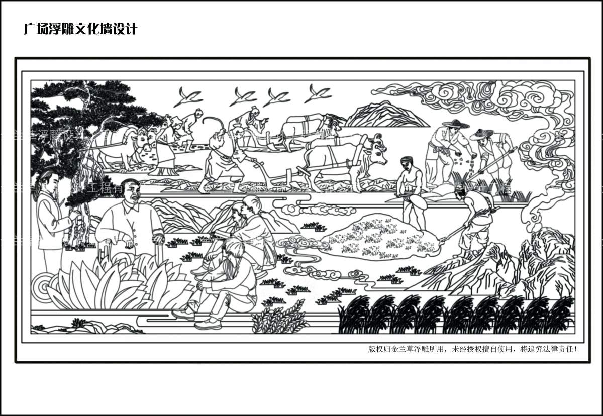 金兰草浮雕公司的设计师依据相互沟通,经过艺术化处理,最终,将浮雕设计图拿到业主方,后期业主方在此基础对浮雕做了一些细微的修改,但整体效果没有改变,因业主方对设计图保密原则,故金兰草小编就不分享最终设计图了。